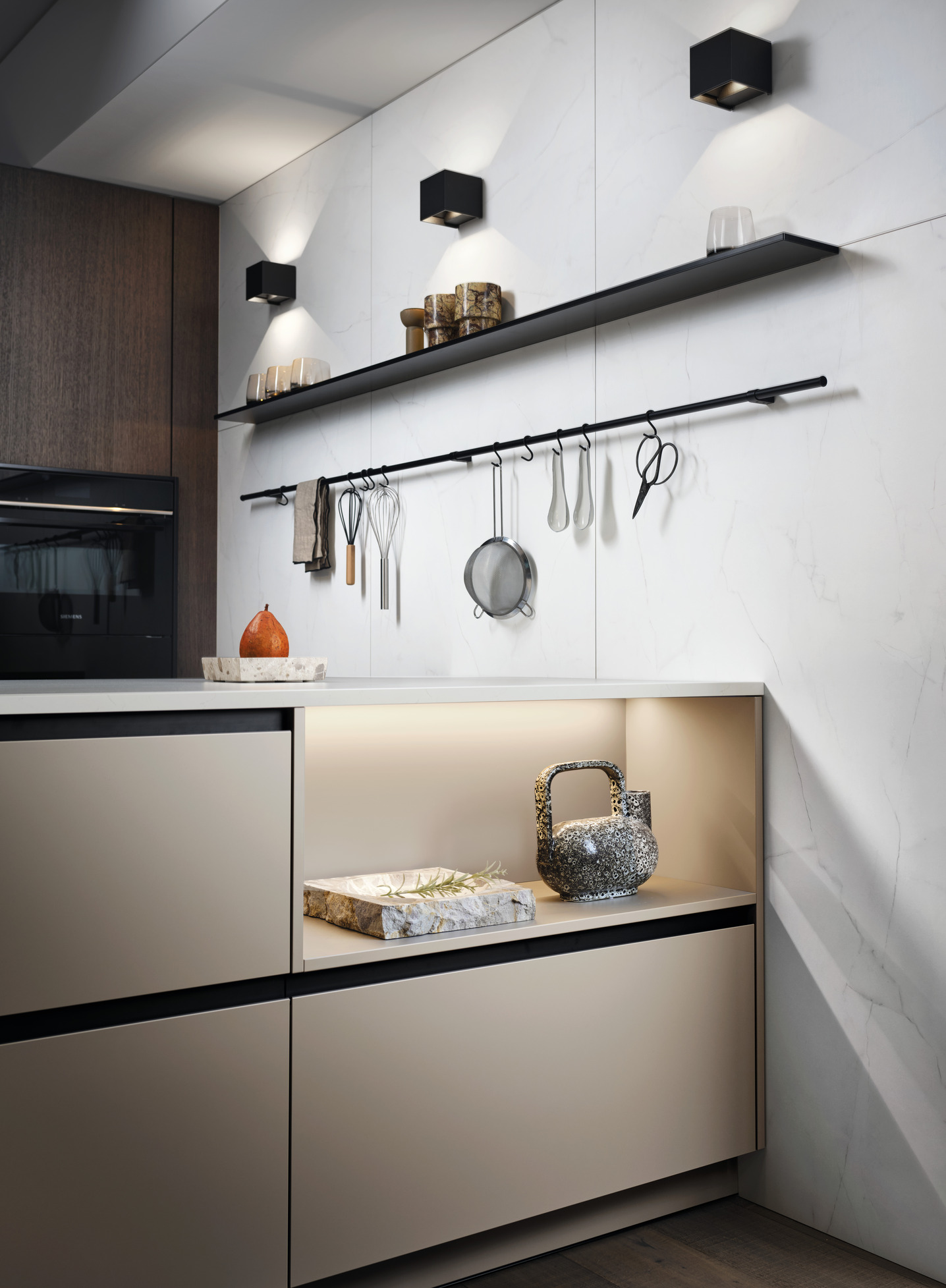 Die aufgesetzte Griffleiste ist in zwei Oberflächen erhältlich - Aluminium edelstahlfarbig eloxiert und schwarz eloxiert - und lässt sich mit unterschiedlichsten Fronten kombinieren. So entsteht maximale Freiheit für deine individuelle Gestaltung: von trendig-modern bis zeitlos-elegant.