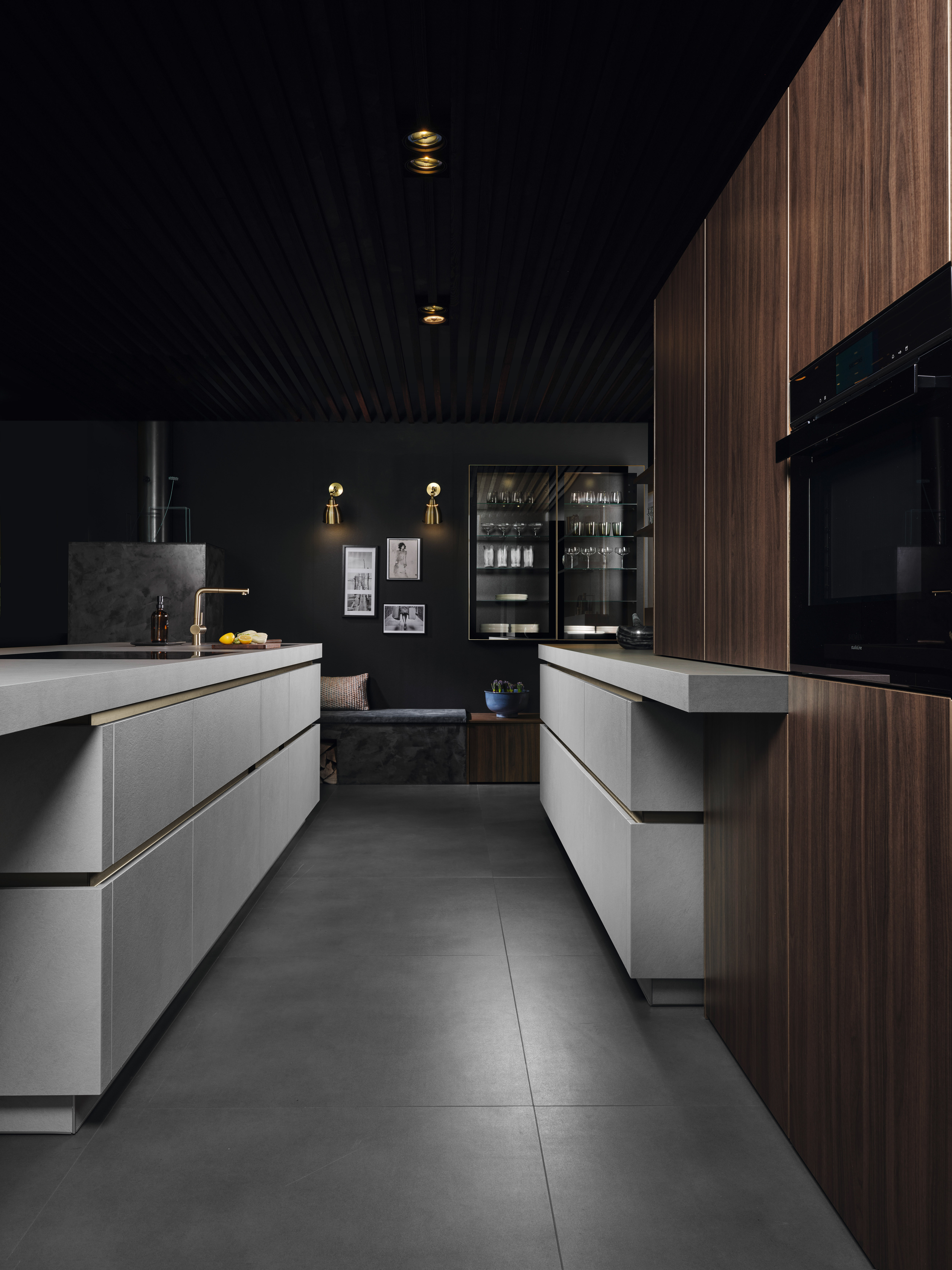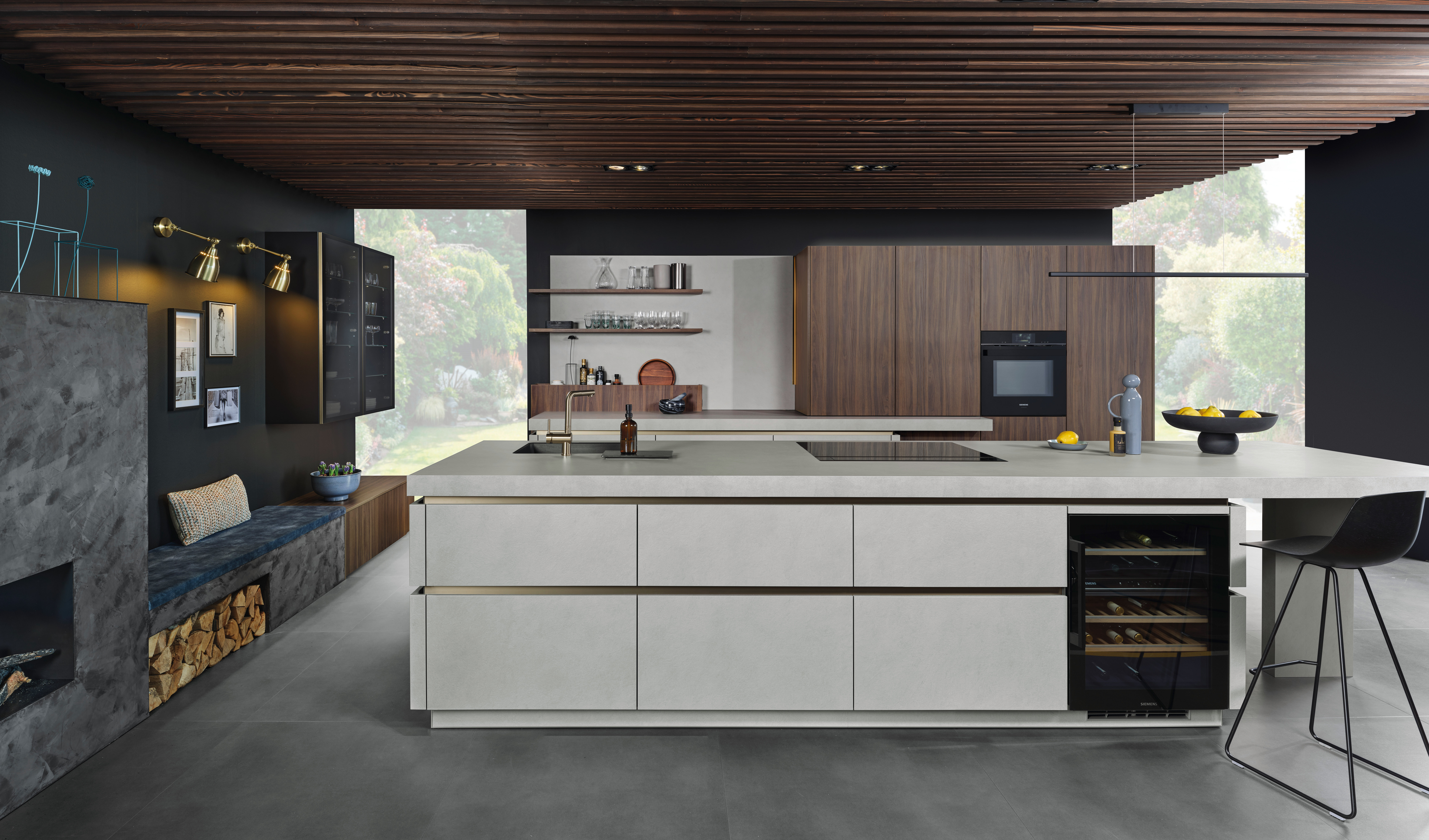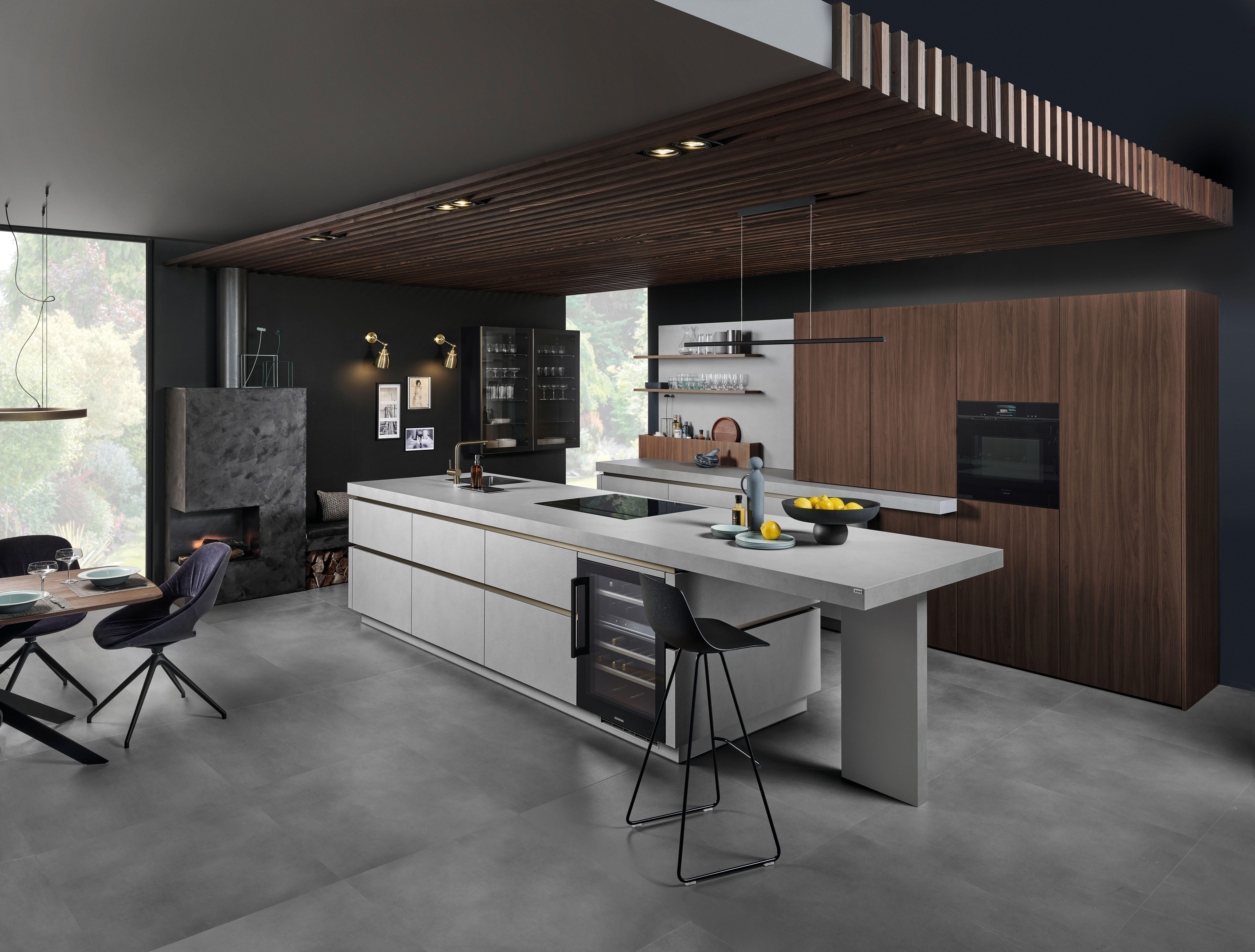 Blickfang der Cemento in malta grigio ist die Kücheninsel mit hochwertiger Relief-Oberfläche in naturgetreuer Betonanmutung. Stauraum, Arbeitsfläche und Sitznische fließen ineinander über und verbinden Form und Funktion. Die kontrastierende Kombination mit Elementen in nuss pavia verleiht dem Ambiente einen behaglichen Rahmen, der sich auch als Einheit mit dem Wohnbereich umsetzen lässt.
