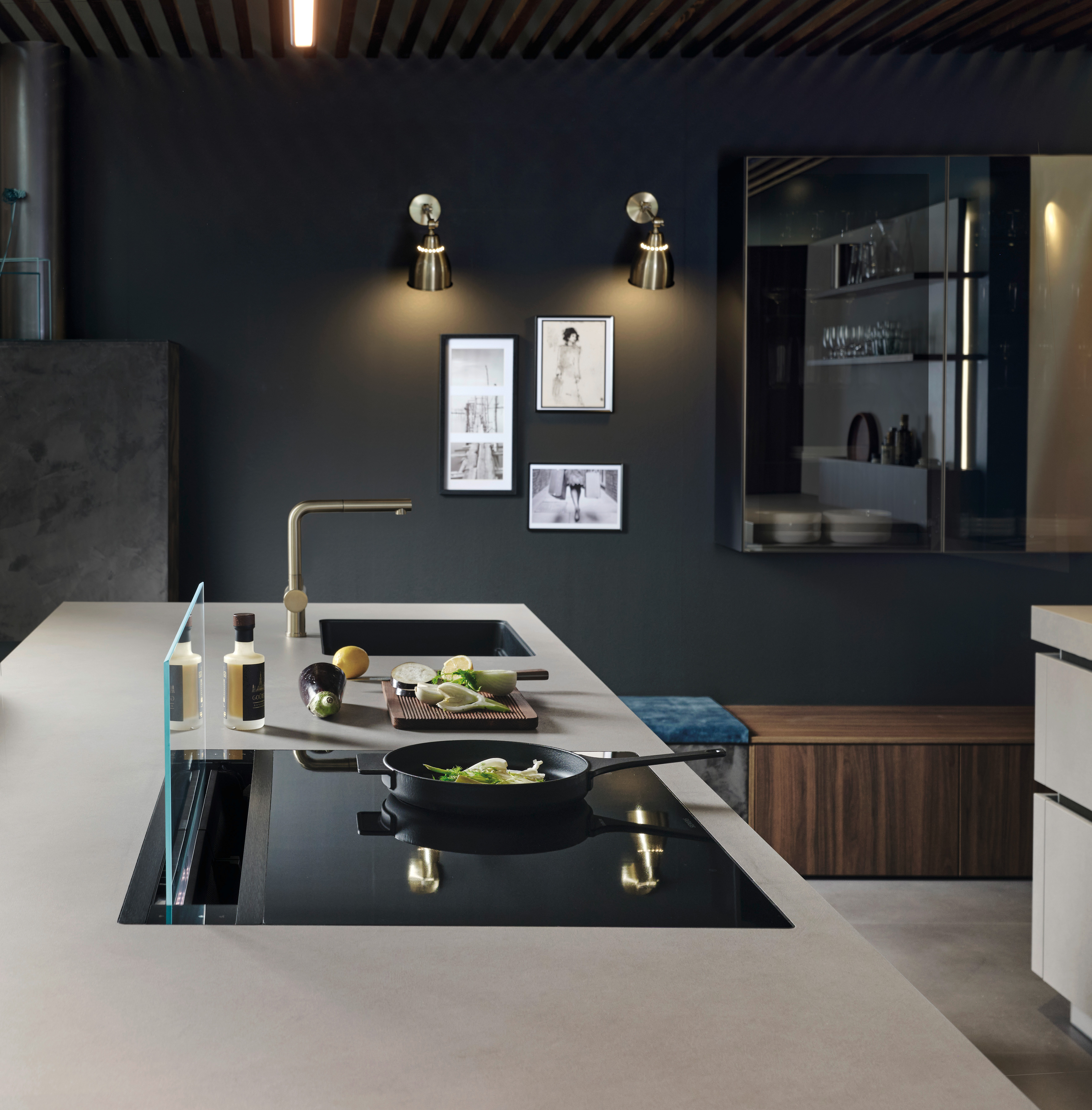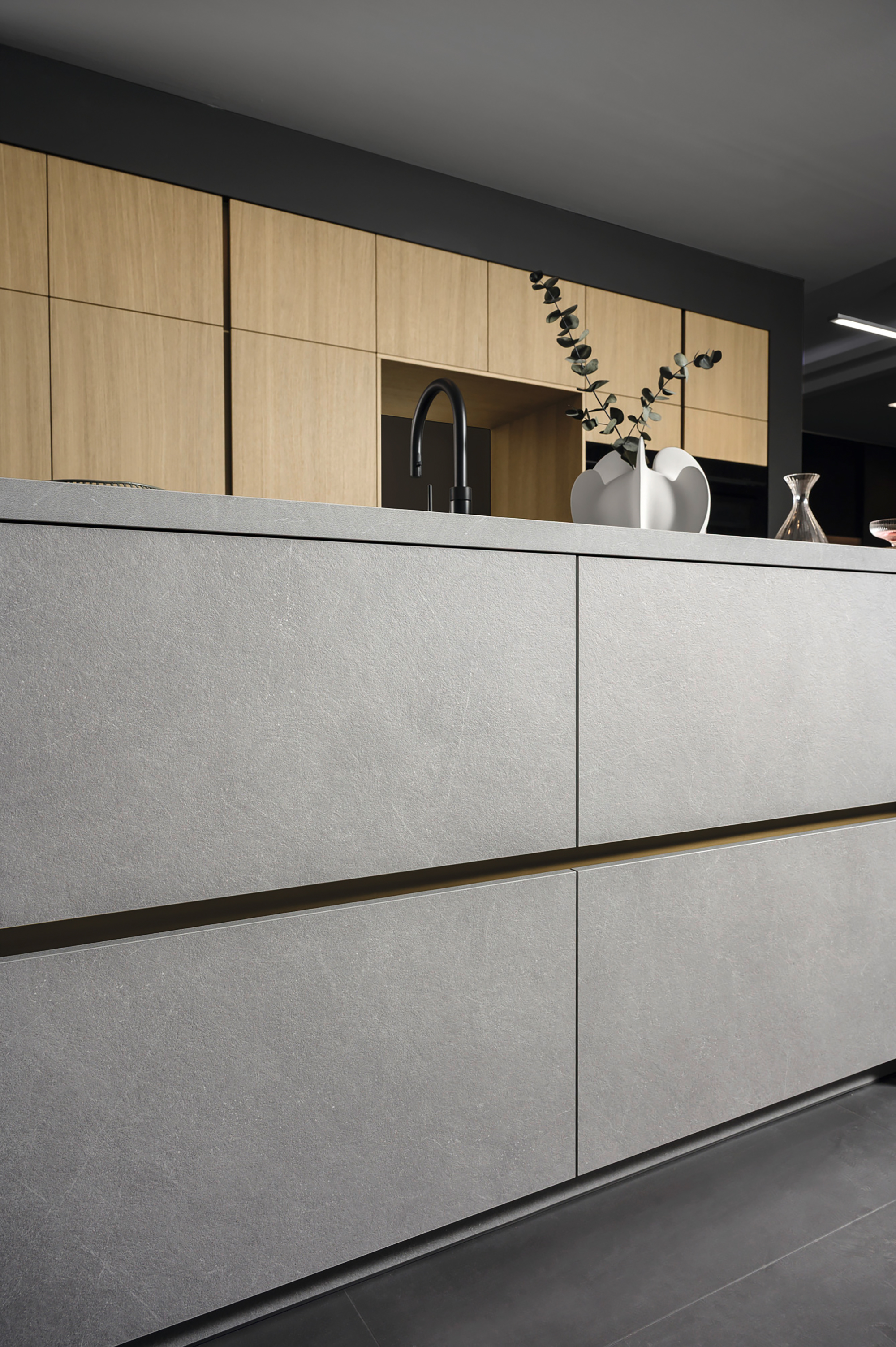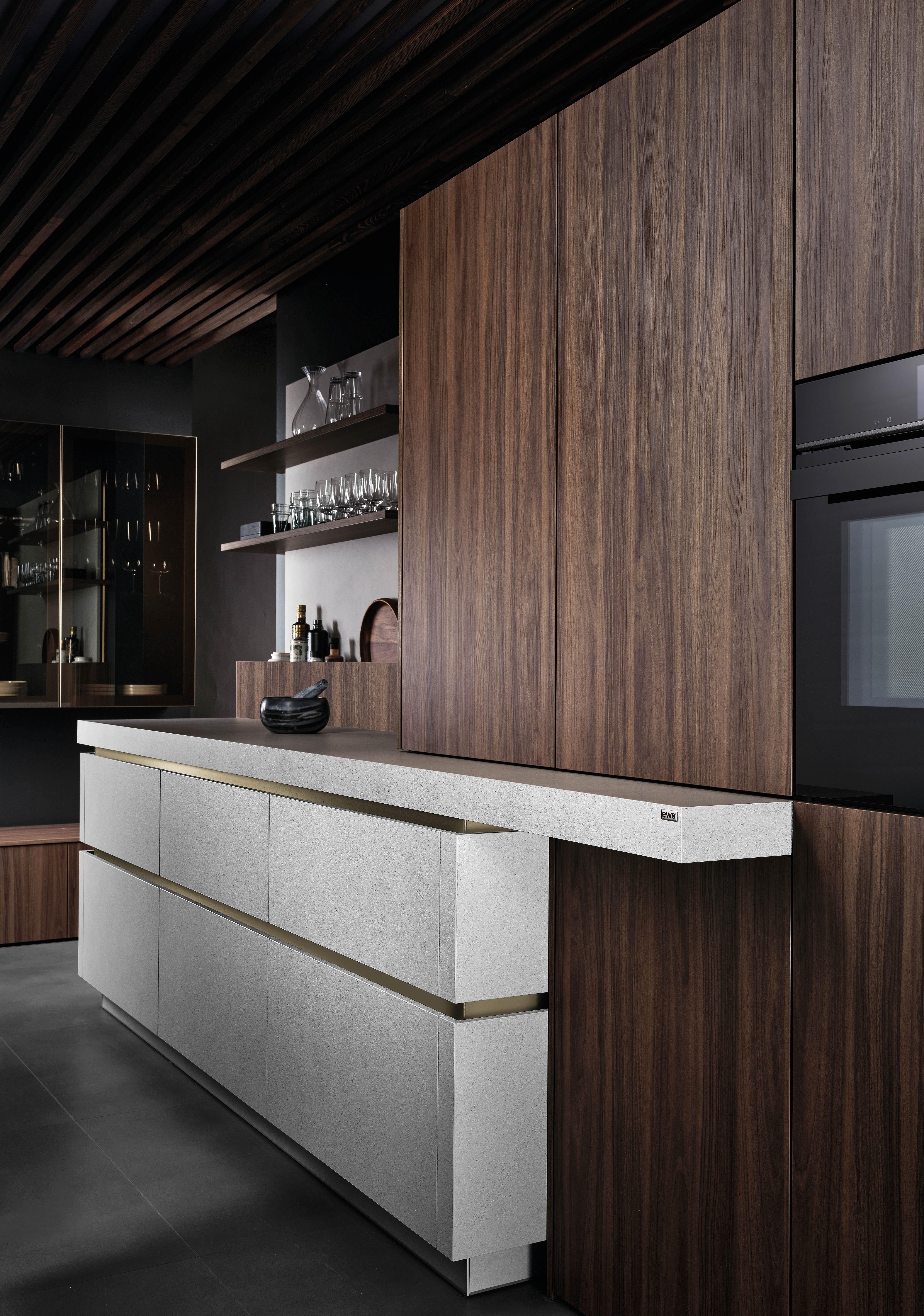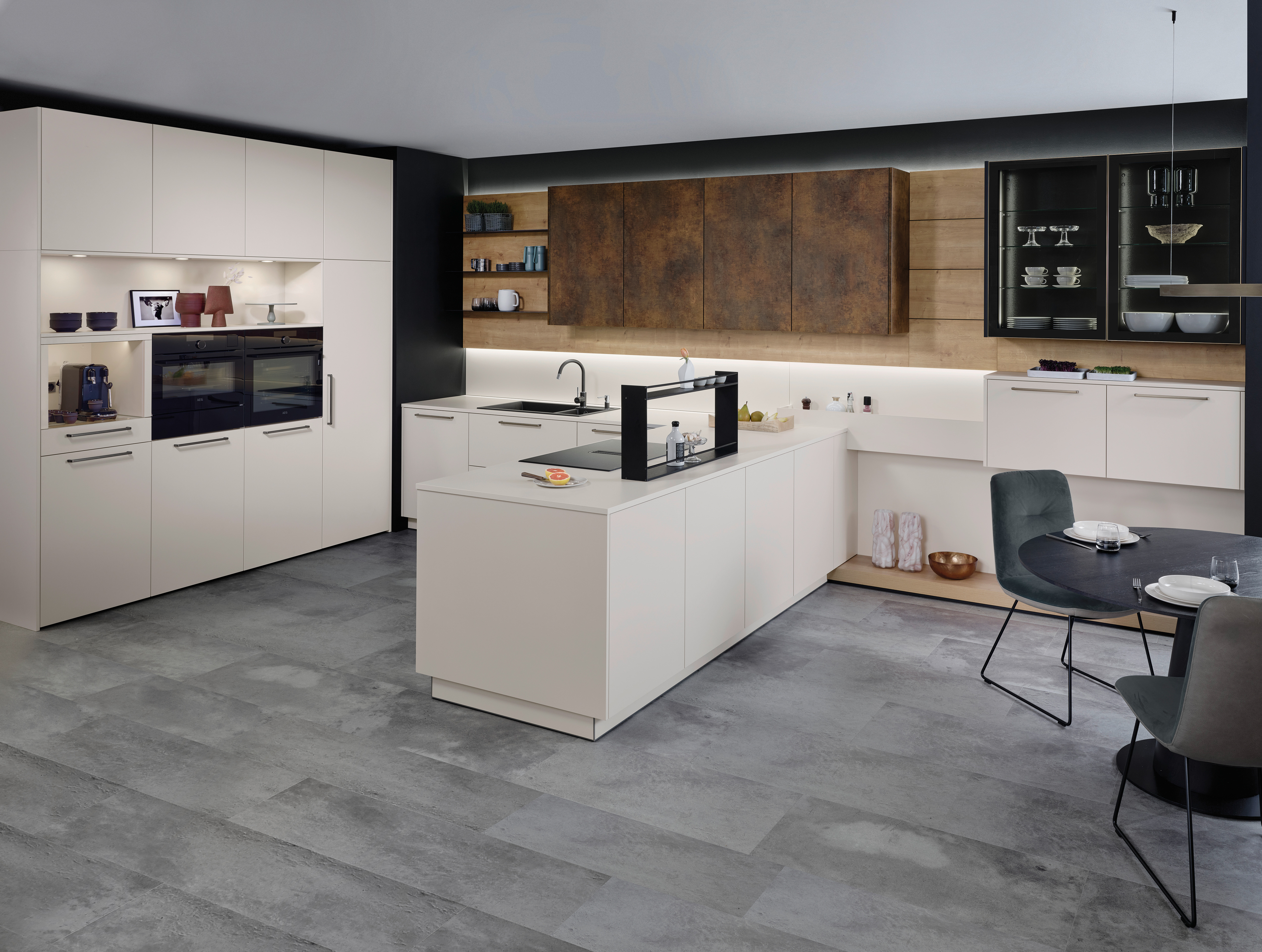 Blickfang der Cemento in malta grigio ist die Kücheninsel mit hochwertiger Relief-Oberfläche in naturgetreuer Betonanmutung. Stauraum, Arbeitsfläche und Sitznische fließen ineinander über und verbinden Form und Funktion. Die kontrastierende Kombination mit Elementen in nuss pavia verleiht dem Ambiente einen behaglichen Rahmen, der sich auch als Einheit mit dem Wohnbereich umsetzen lässt.