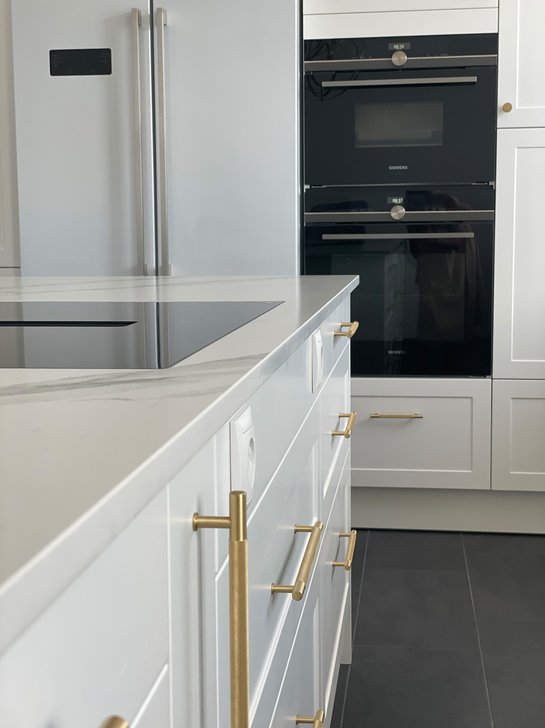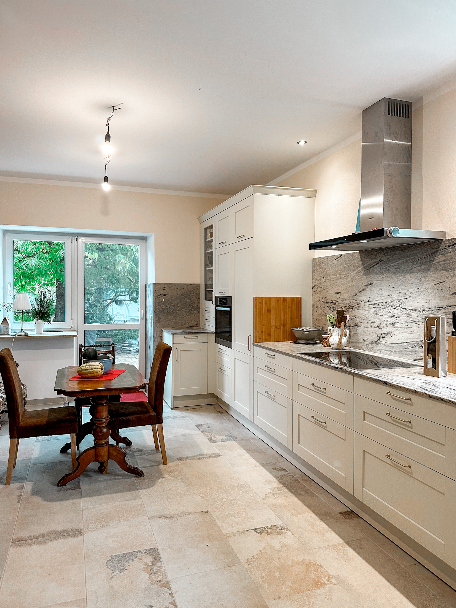 Weitere typische Merkmale sind verschnörkelte Details wie Gesimsleisten, Griffe im rustikalen Stil und eine warme Farbpalette