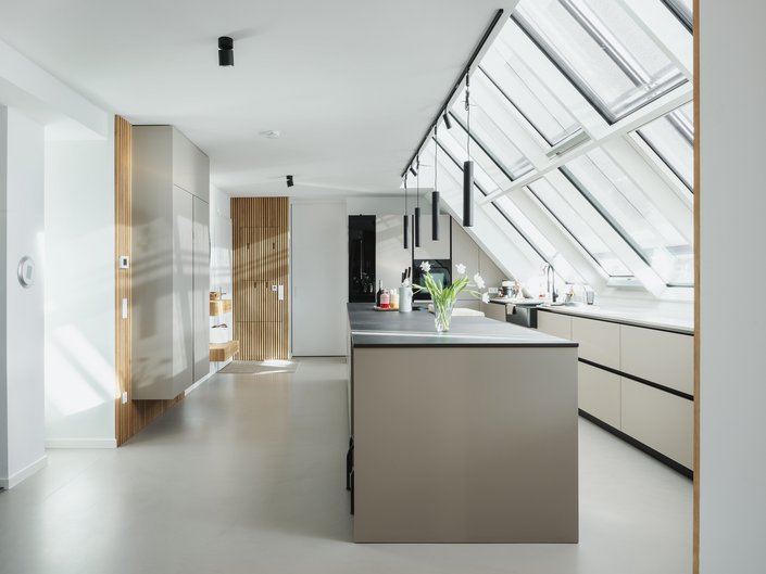 Küche und Möbel sind nicht nur optisch aufeinander abgestimmt, sondern sorgen auch für ein ruhiges, harmonisches Raumgefühl.