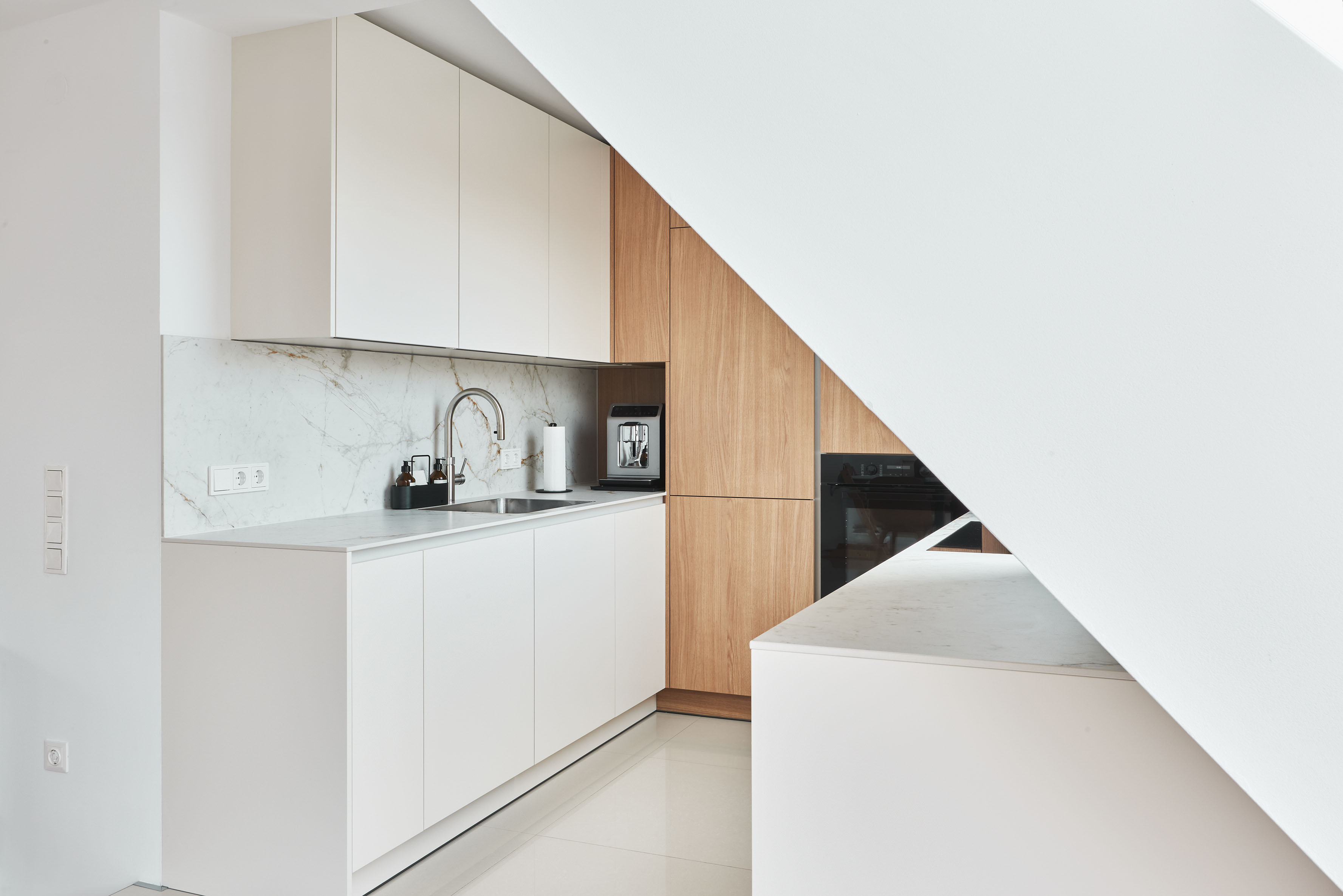 Wählen Sie Arbeitsplatten, Schränke und Rückwände, die in ähnlichen Tönen gehalten sind, aber durch ihre Beschaffenheit einen subtilen Kontrast bieten.